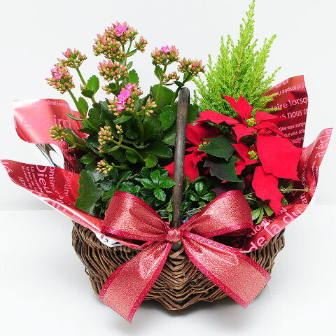 クリスマス限定 ポインセチアの寄せ鉢ミックスについて・12月・クリスマスの人気者ポインセチアと季節の旬な鉢花、そのとき入荷の観葉植物をかっこ良くデザインして、カゴにアレンジしお届けいたします。